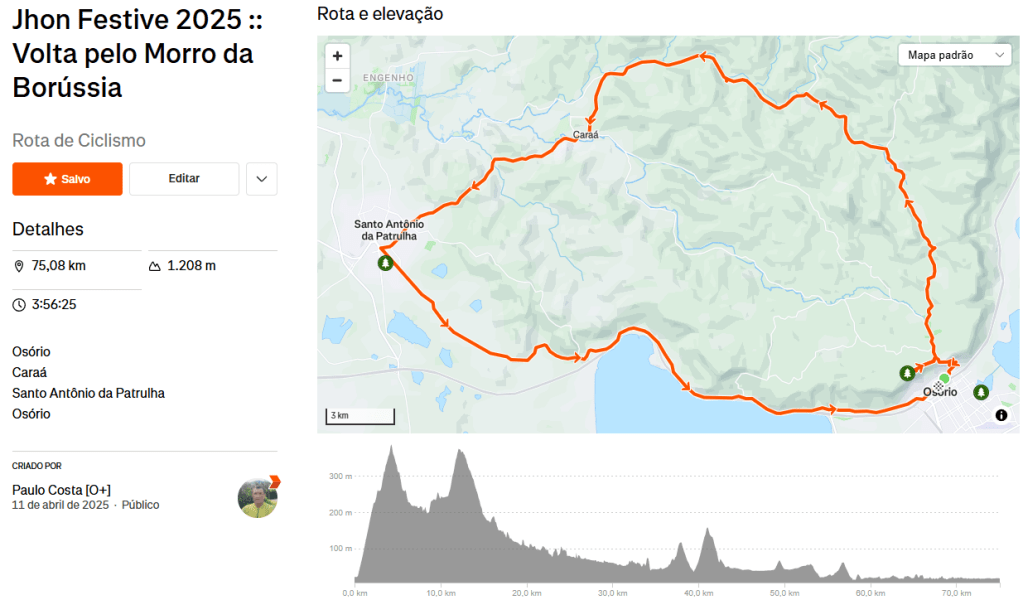 O Jhon Festive 2025 by Paladinos teve uma rota circular, partindo de Osório, passando pelo Morro da Borússia, seguindo a rota Norte,(pelos vales do Arroio Bocó e do Rio dos Sinos), Caraá e Santo Antônio da Patrulha antes de retornar a Osório pela RS030, uma alternativa à BR-290 (Free-Way).